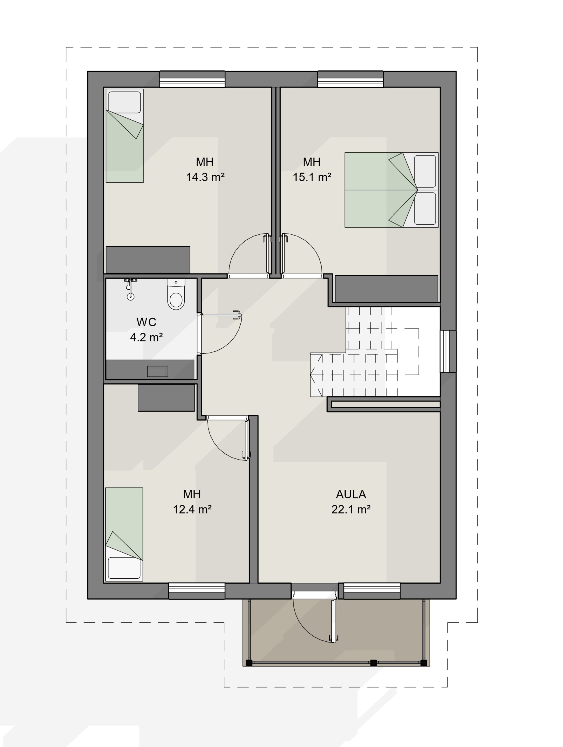 - Alakerrassa yksi makuuhuone, yläkerrassa kolme